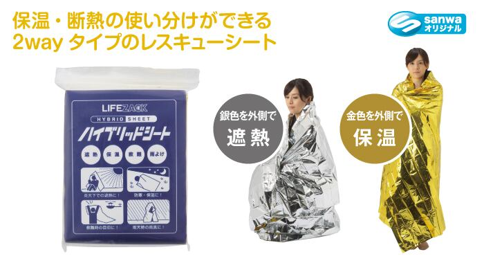 寒い時は金色の面を外側にして保温、暑いときは銀色の面を外側にして断熱できます。 反射性の高い素材のため、救難時の目印としても活躍します。 雨天時は雨よけとしても使用できます。 コンパクトなパッケージで、非常時の備蓄、持ち運びに便利です。 サイズ 125×225cm 材質 PETポリスエステルフィルム